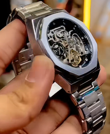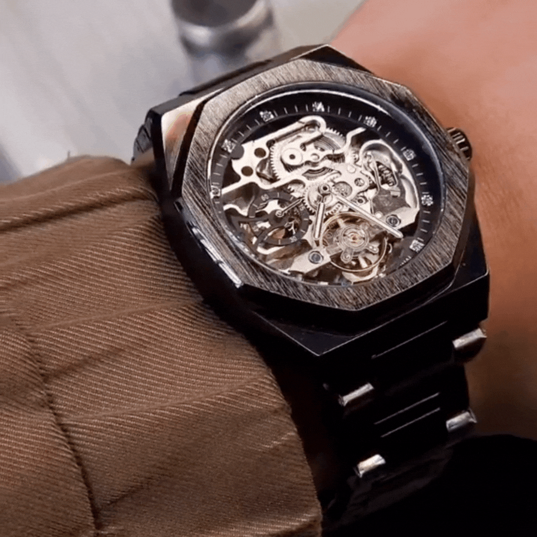 Su estructura abierta revela el corazón del reloj en acción. No es solo un accesorio, es una pieza de ingeniería que puedes ver en funcionamiento.