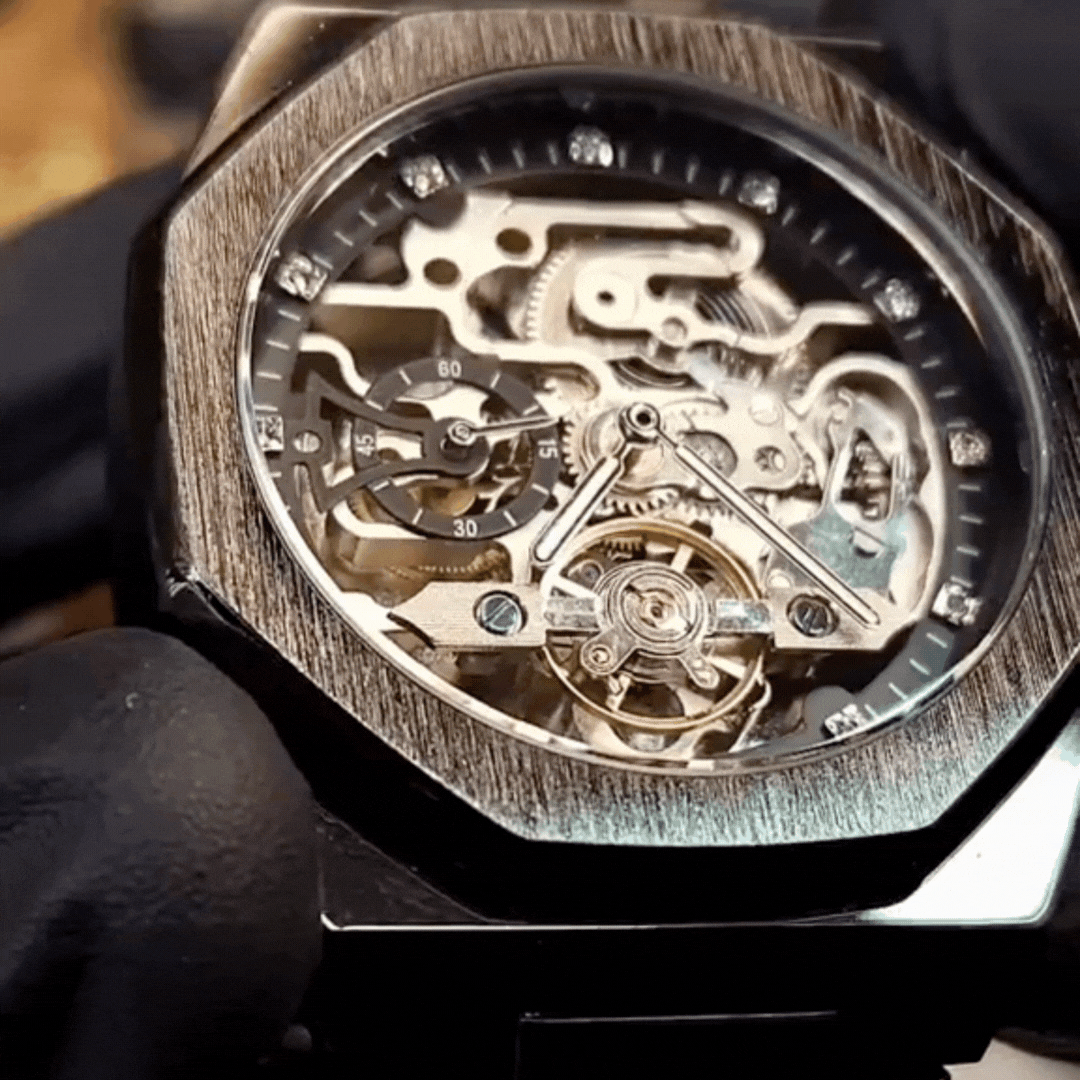 Este no es solo un reloj: es una declaración de estilo. Su esfera de diamante 3D atrapa la luz como ningún otro, mientras el Tourbillon Irregular y el diseño esqueleto mecánico dejan ver su sofisticado corazón en movimiento.